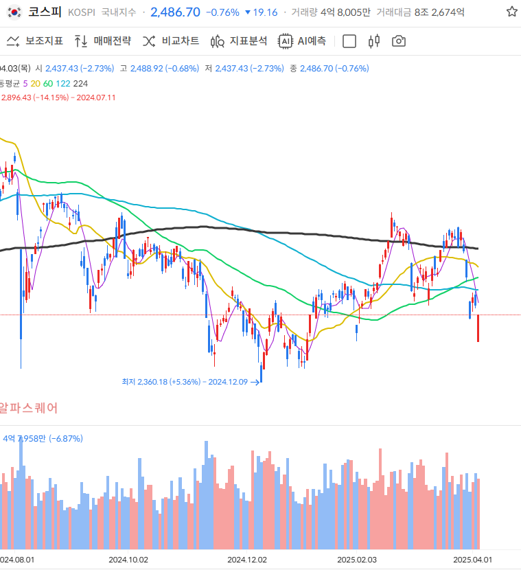 [2025-04-08] 니케이 6% 급등에도 코스피는 ‘찔끔’…환율·유증·반도체 이슈 총정리 (0) 2025.04.08 [2025-04-07] 블랙먼데이 강타한 아시아증시…코스피·코스닥 5% 폭락, 원화·금값 급변동 (0) 2025.04.08 [2025-04-04] 정치 리스크 해소에 증시 변동성 확대…2차전지·엔터株 강세, 반도체는 부진 (0) 2025.04.04 📈 2025년 4월 2일 증시 정리: 코스피·코스닥 1%대 하락…시총 상위주 동반 약세 (0) 2025.04.02 2025-03-27 목요일 증시 요약_ 삼성 HBM3E 기대감에 반도체 테마 강세, 외국인 수급 유입 (0) 2025.03.27