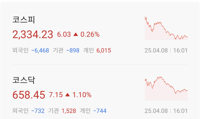 [2025-04-10] 코스피 6.6% 폭등! 반도체·조선주 강세와 美·中 관세 이슈 총정리 (0) 2025.04.10 [2025-04-09] 미 국채 금리 급등·상호관세 발효 여파에 코스피 2300선 붕괴! (0) 2025.04.09 [2025-04-07] 블랙먼데이 강타한 아시아증시…코스피·코스닥 5% 폭락, 원화·금값 급변동 (0) 2025.04.08 [2025-04-04] 정치 리스크 해소에 증시 변동성 확대…2차전지·엔터株 강세, 반도체는 부진 (0) 2025.04.04 [2025-04-03] 연기금 순매수에 낙폭 축소…52주 신저가 속 코스피 하락 마감 (2) 2025.04.03