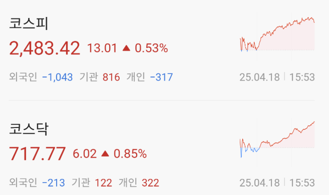 2025년 4월 18일 국내 증시는 글로벌 변동성 속에서도 비교적 안정적인 흐름을 이어갔습니다. 특히 코스피는 기관의 이틀 연속 순매수세에 힘입어 0.57% 상승 마감했으며, 코스닥도 0.58% 상승하며 반등세를 보였습니다. 그간 코스피는 글로벌 금리 불확실성과 반도체 업황 둔화 우려로 약세 흐름을 보였지만, 최근 외국인의 매도세가 다소 진정되고, 기관 중심의 저가 매수세가 유입되면서 지수가 바닥을 다지는 모습입니다.